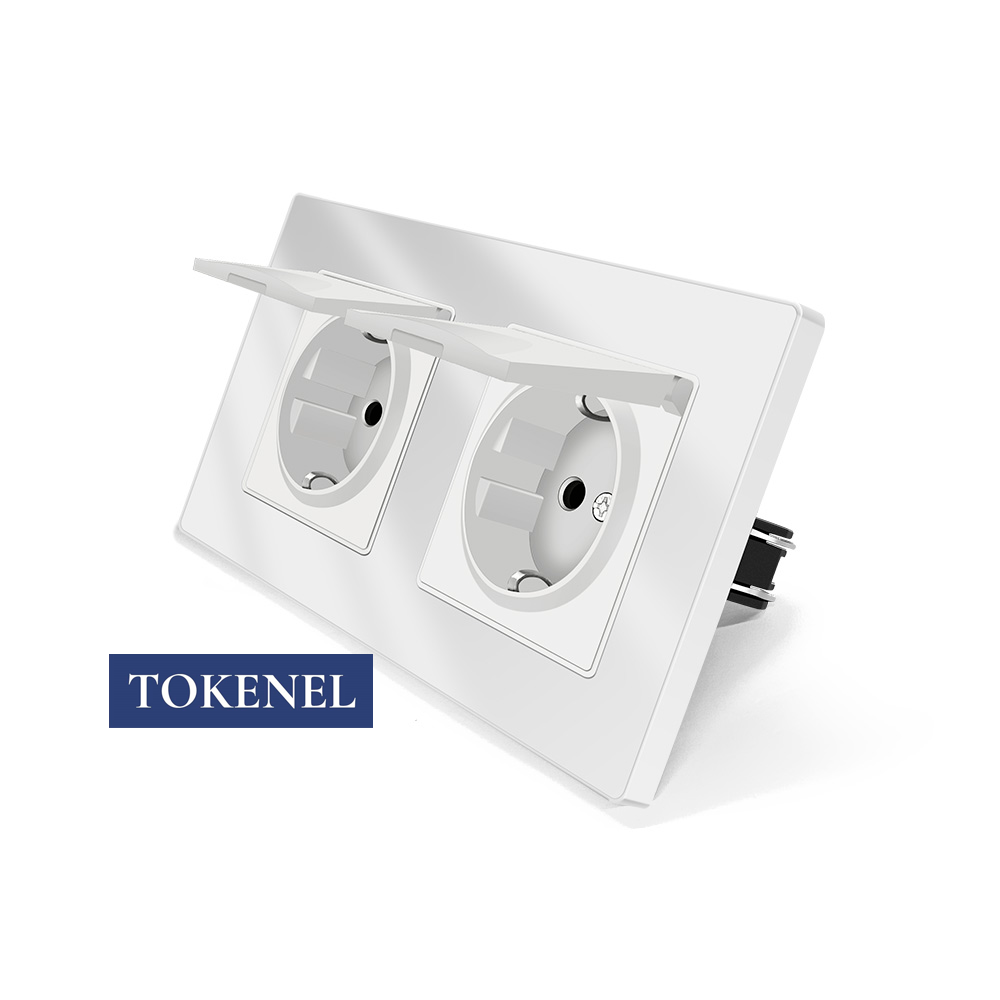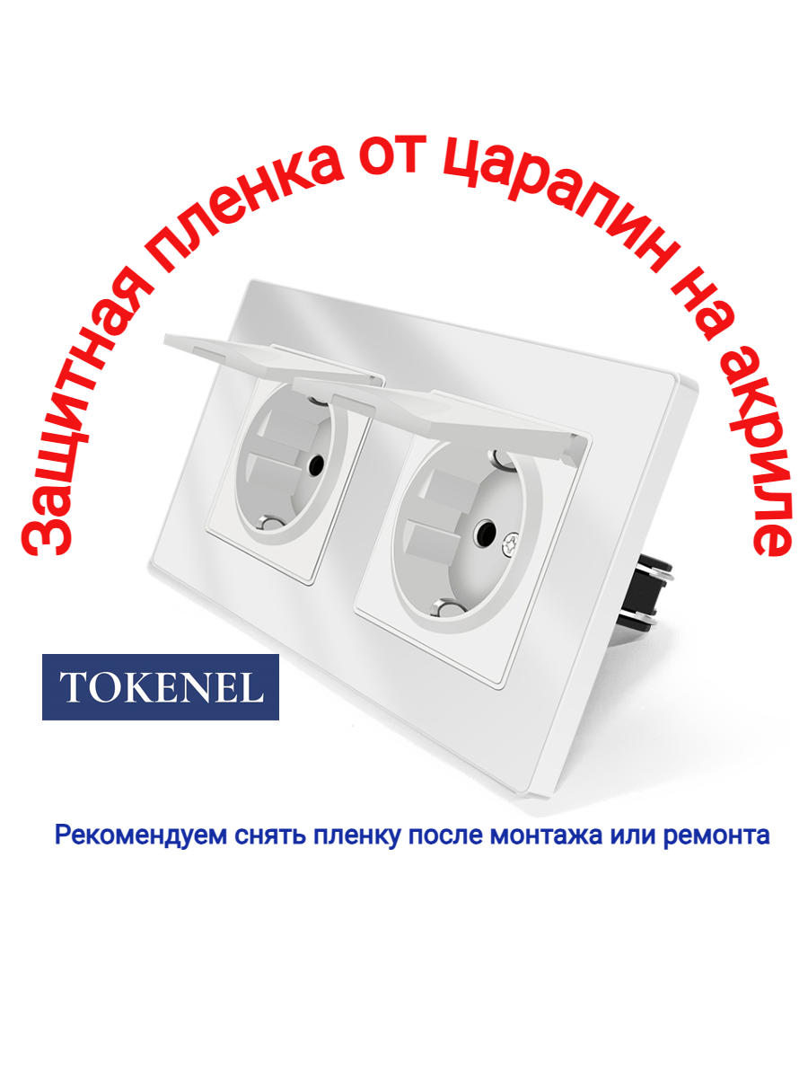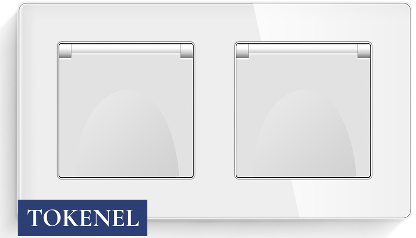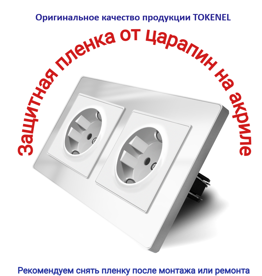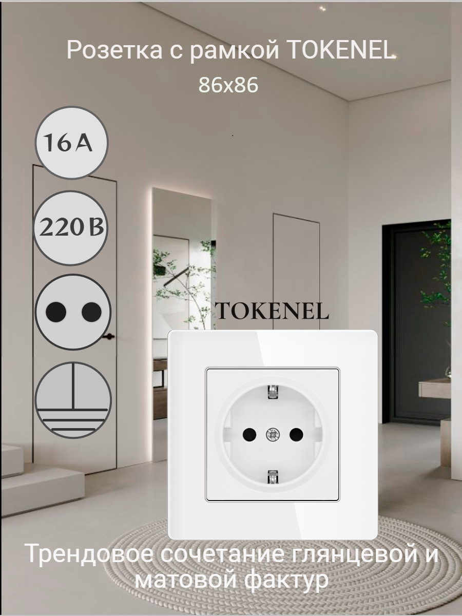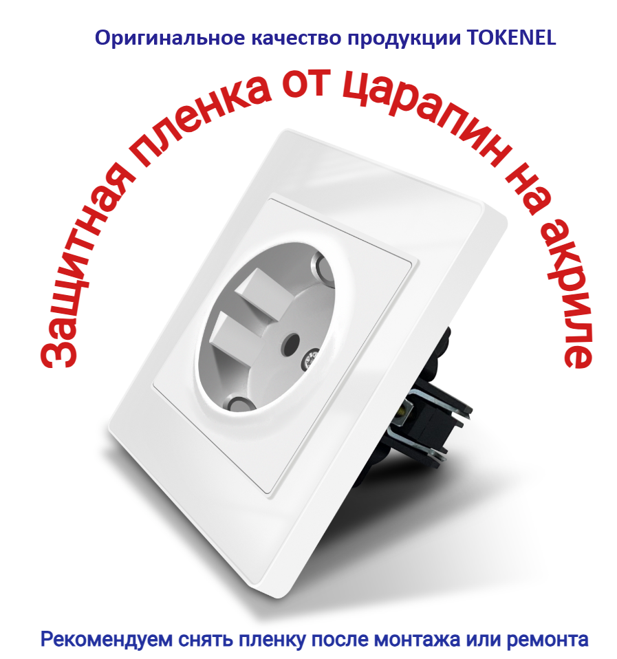 T000921500/ Розетка встраиваемая TOKENEL электрическая с заземлением и защитными шторками, рамка 86х86 мм, 16A, акриловое стекло, белая