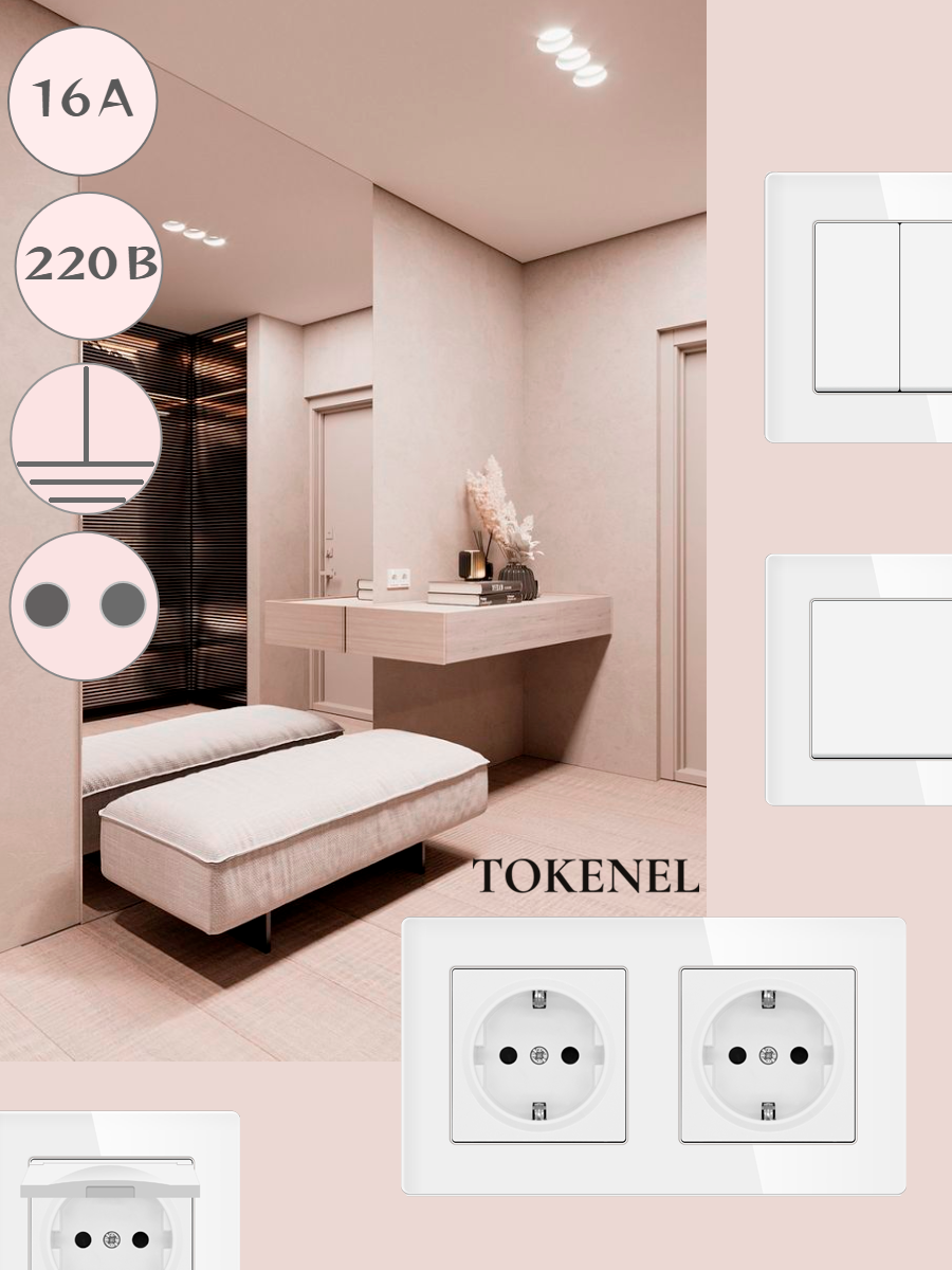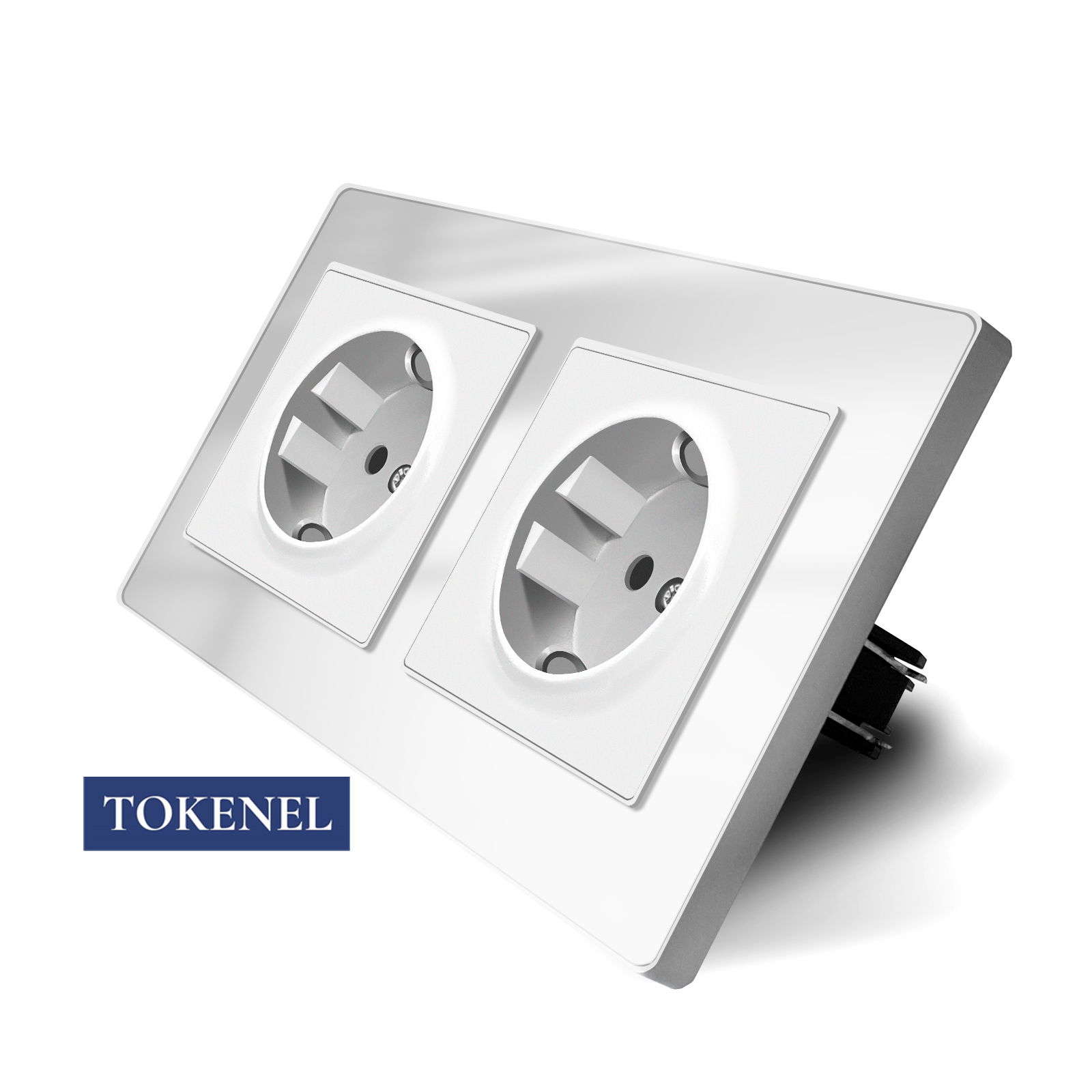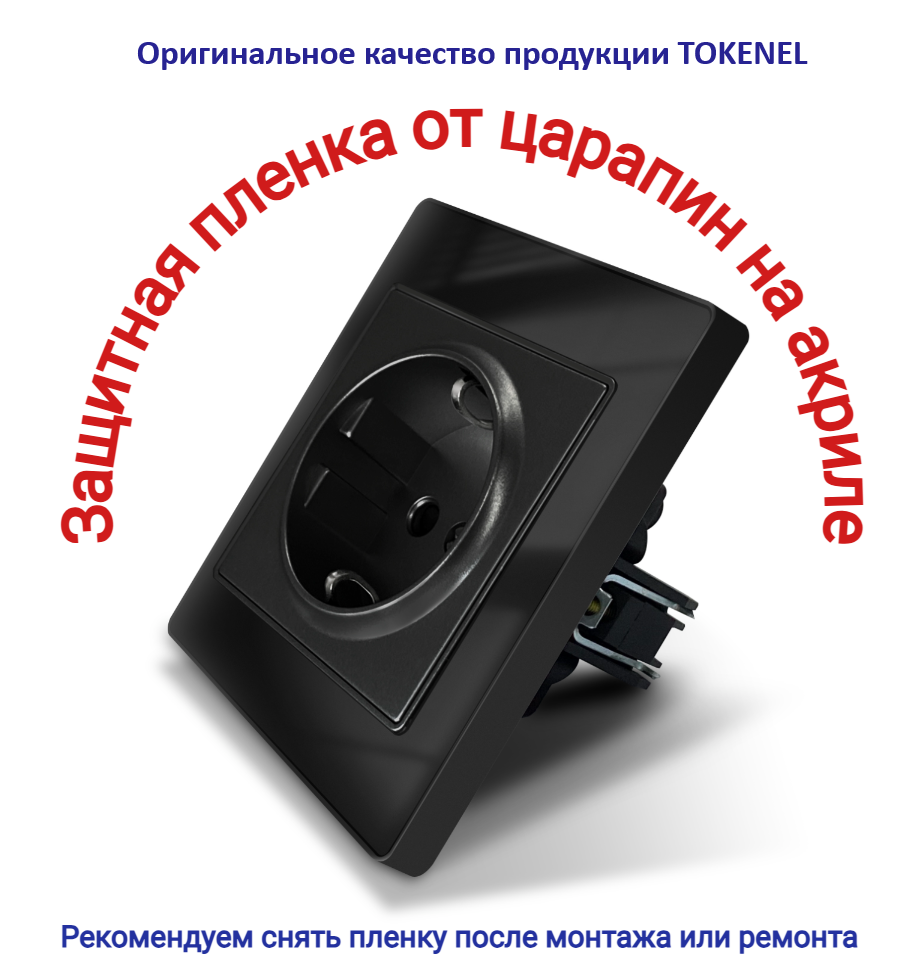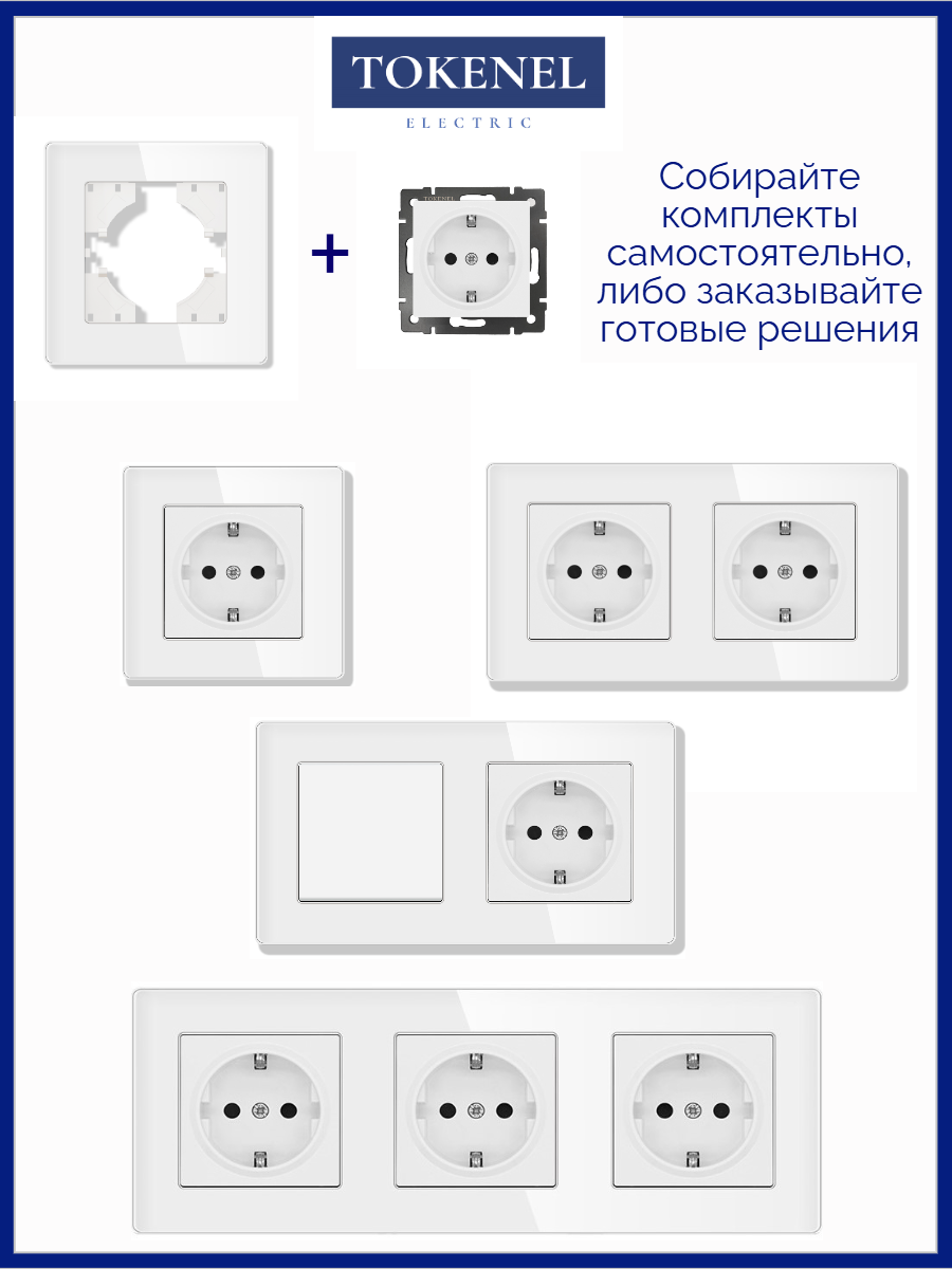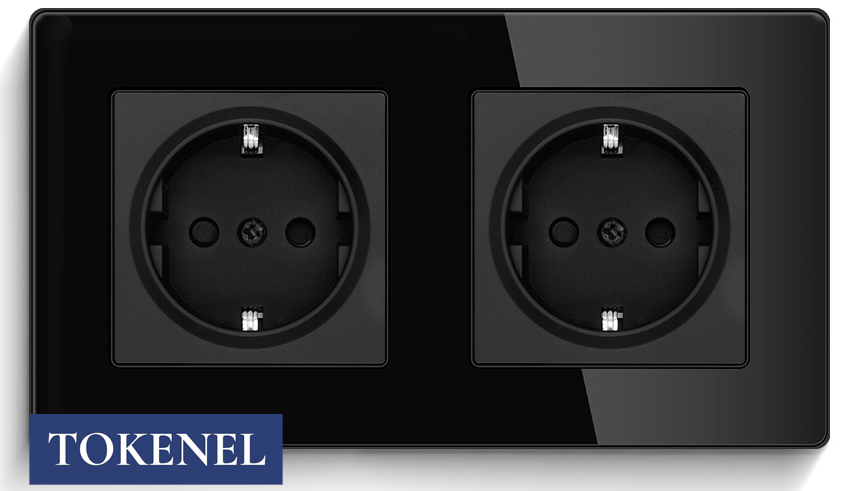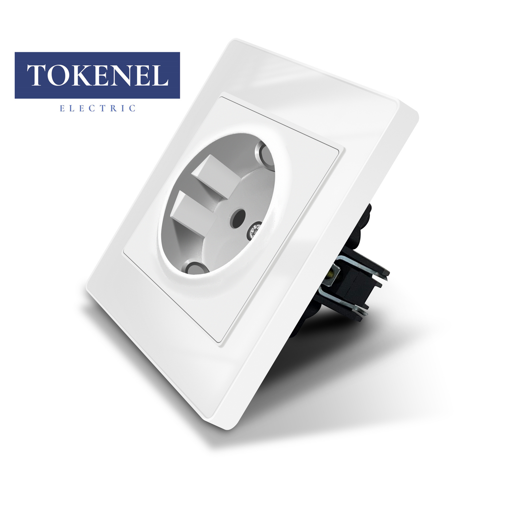 T000921500/ Розетка встраиваемая TOKENEL электрическая с заземлением и защитными шторками, рамка 86х86 мм, 16A, акриловое стекло, белая