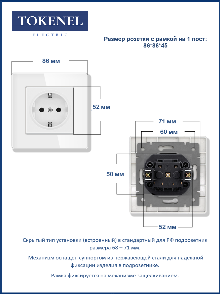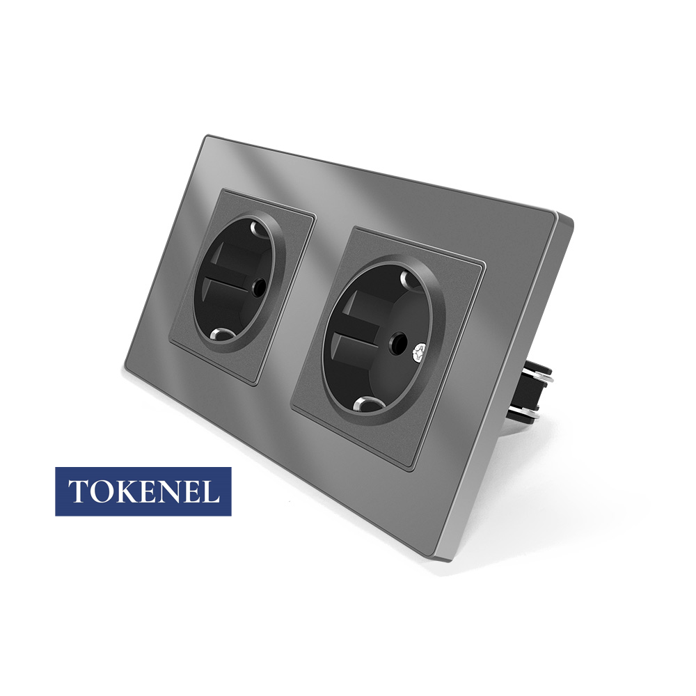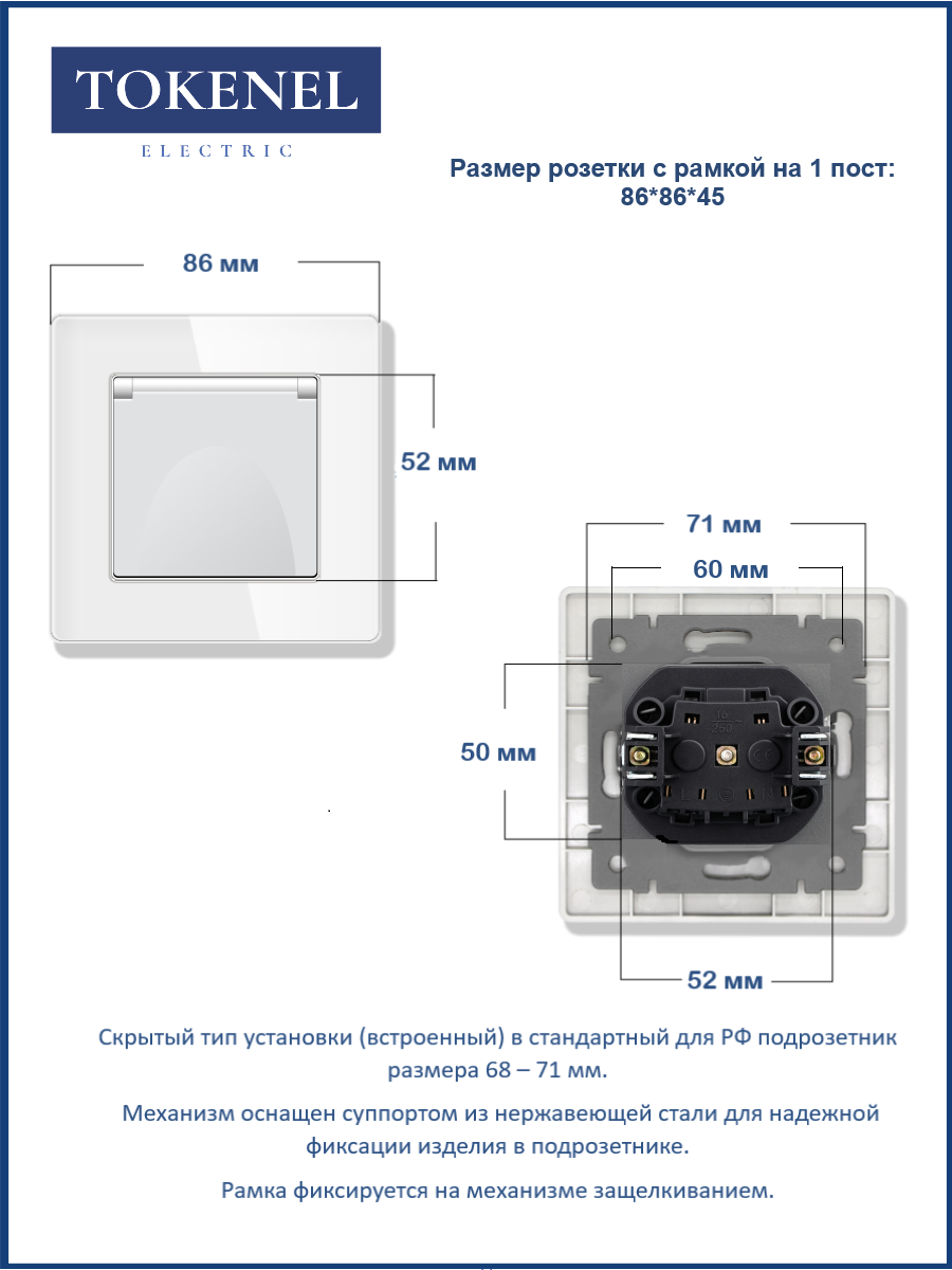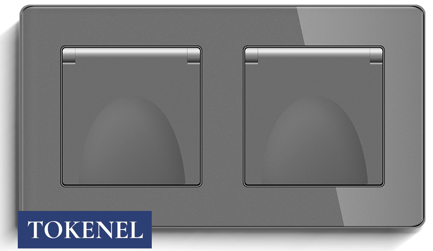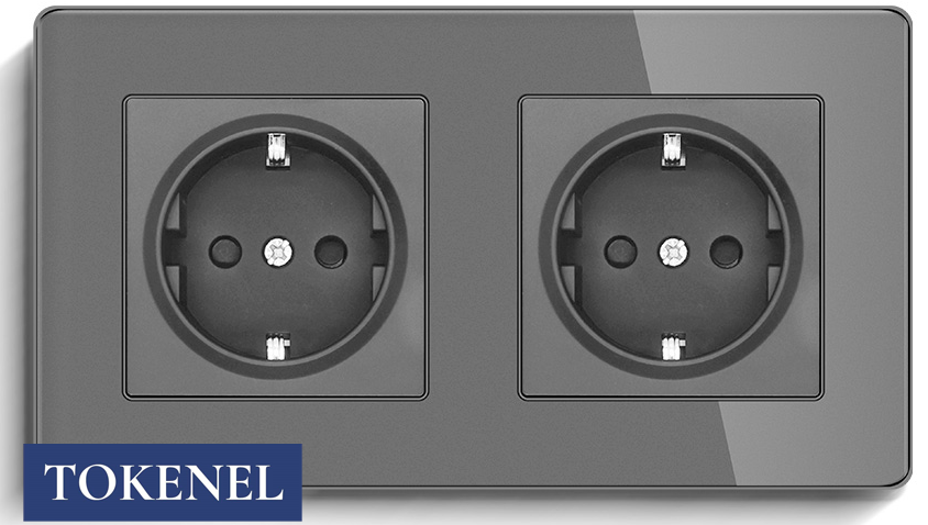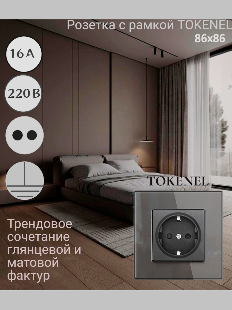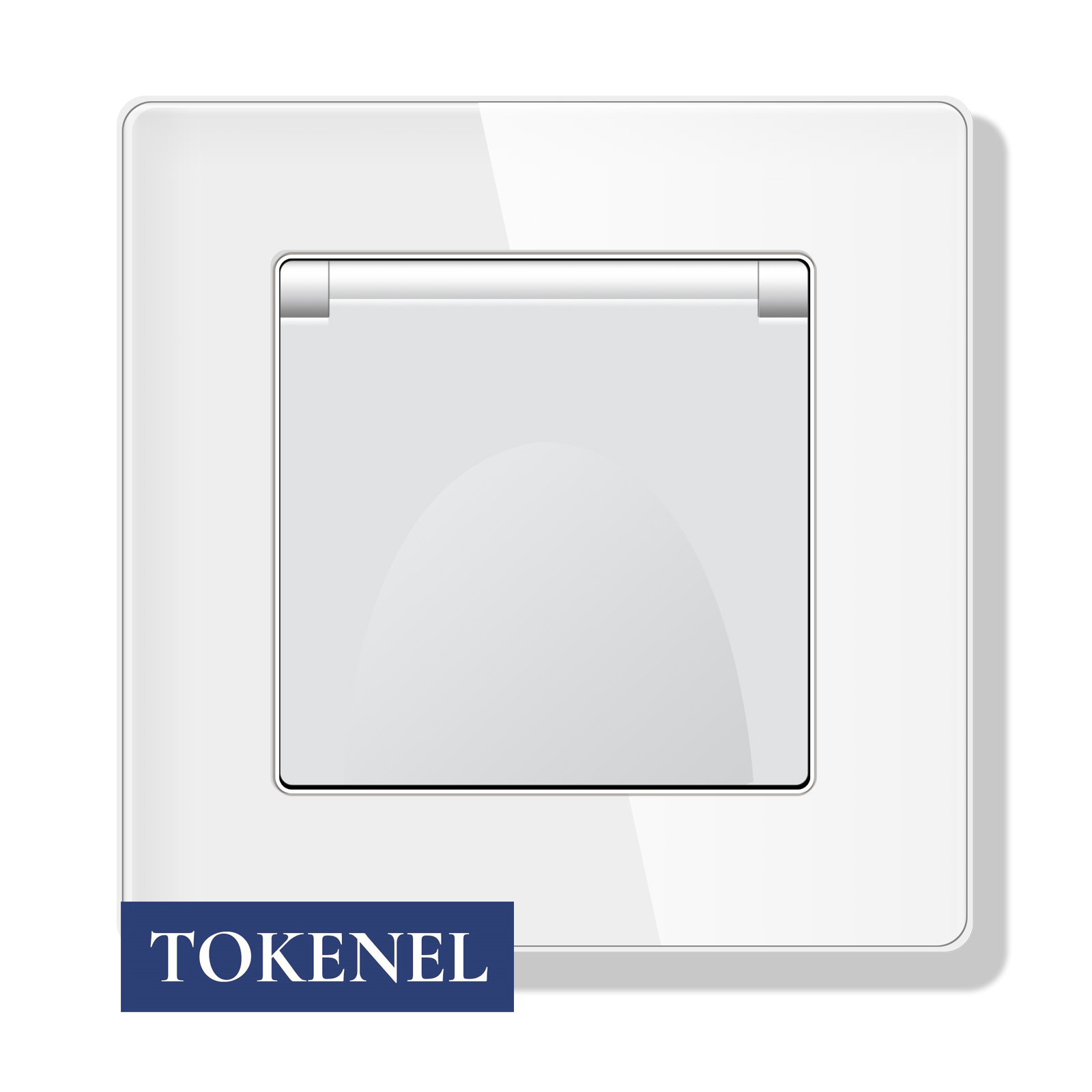 T0000901500/ Розетка встраиваемая TOKENEL электрическая с заземлением и защитными шторками, рамка 86х86 мм, 16A, акриловое стекло, белая