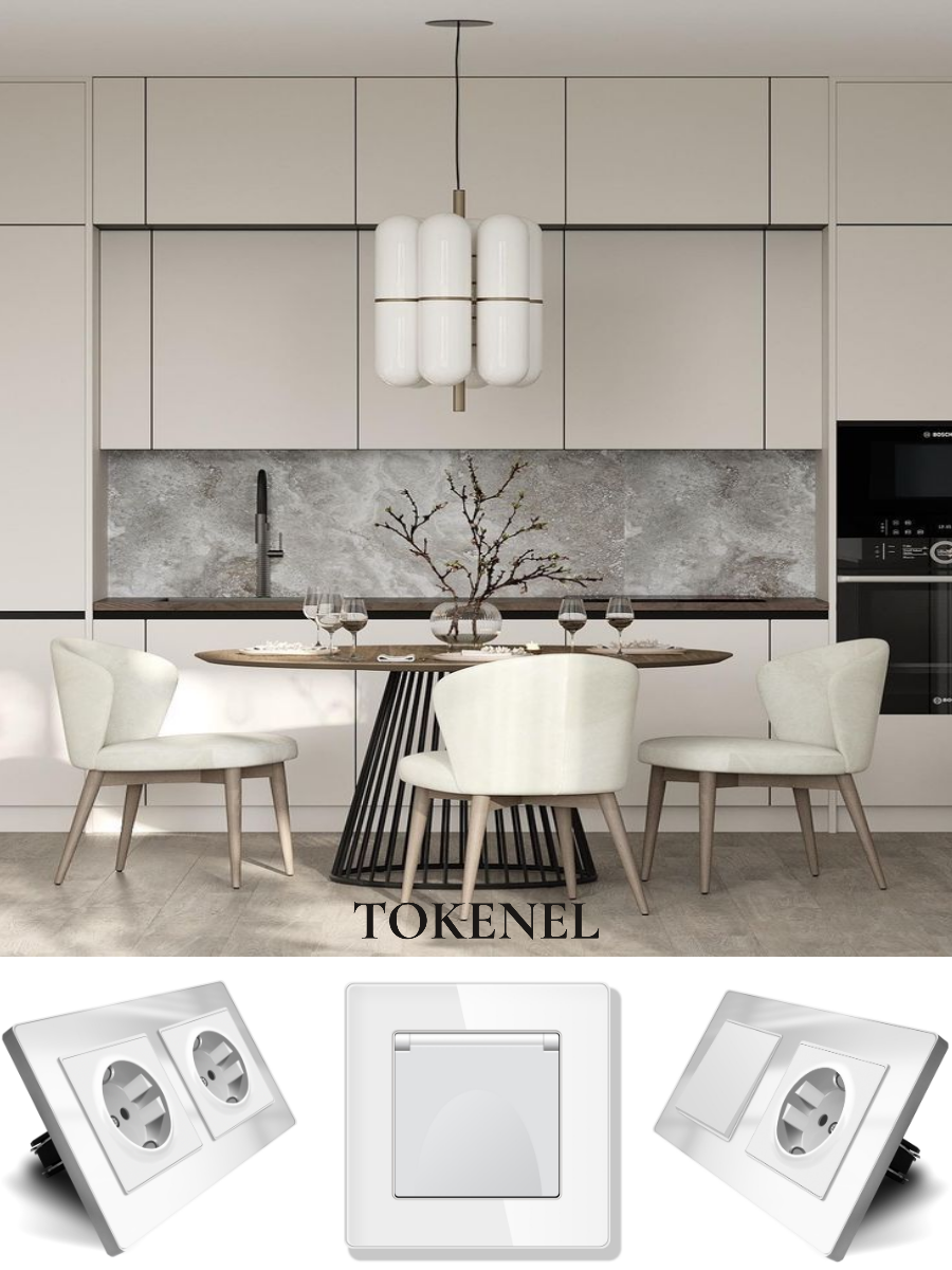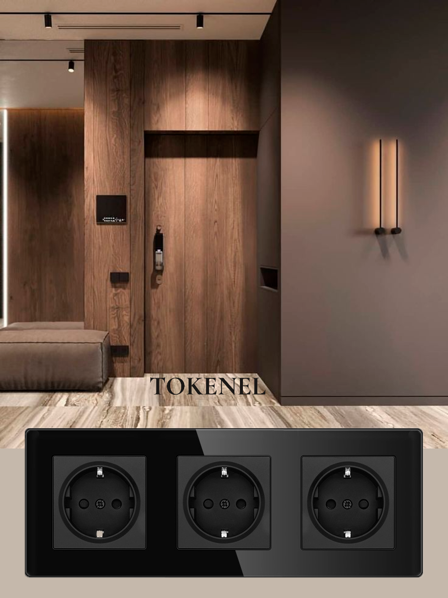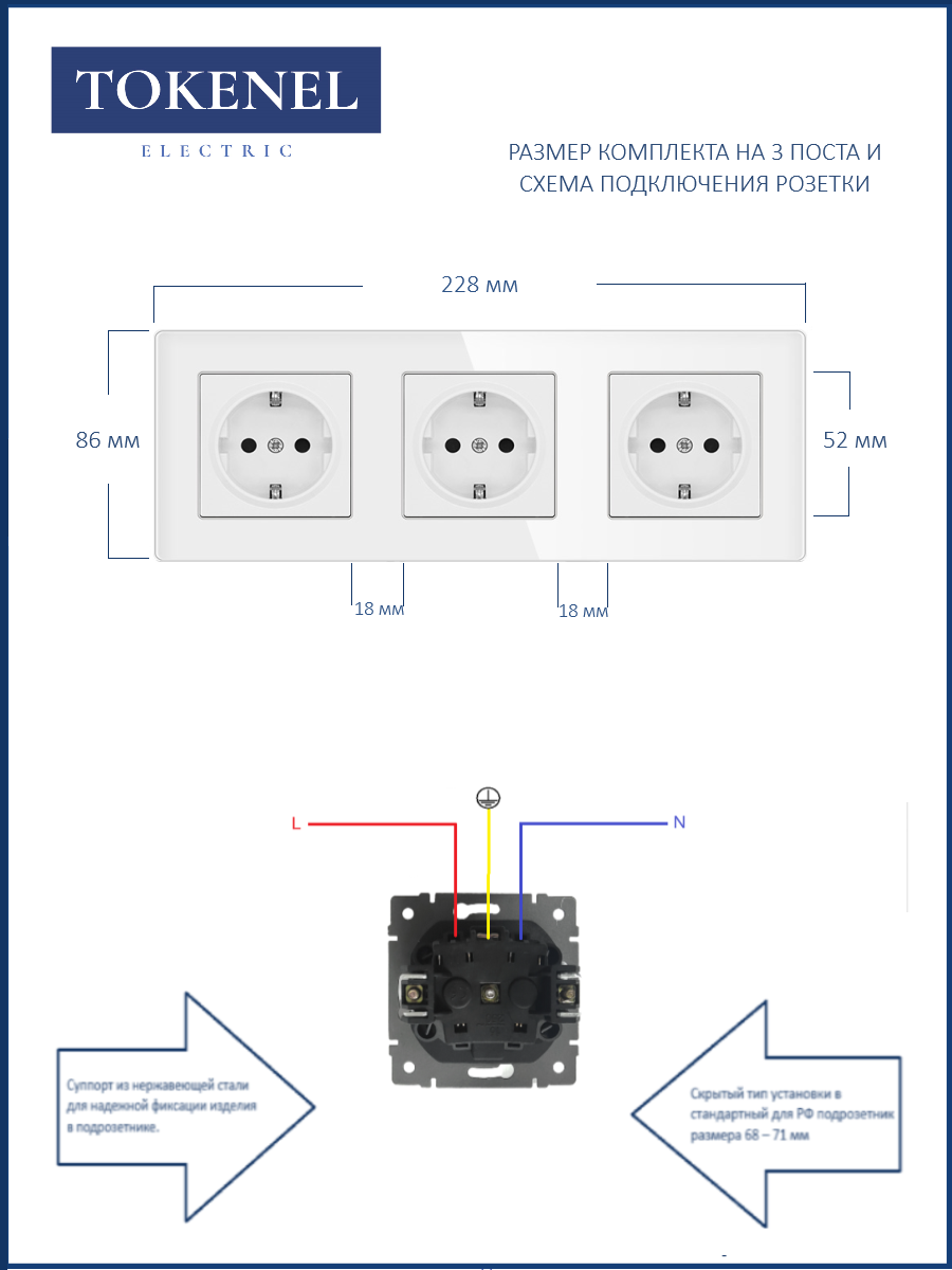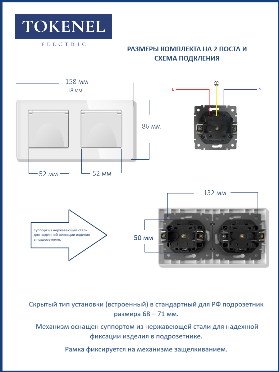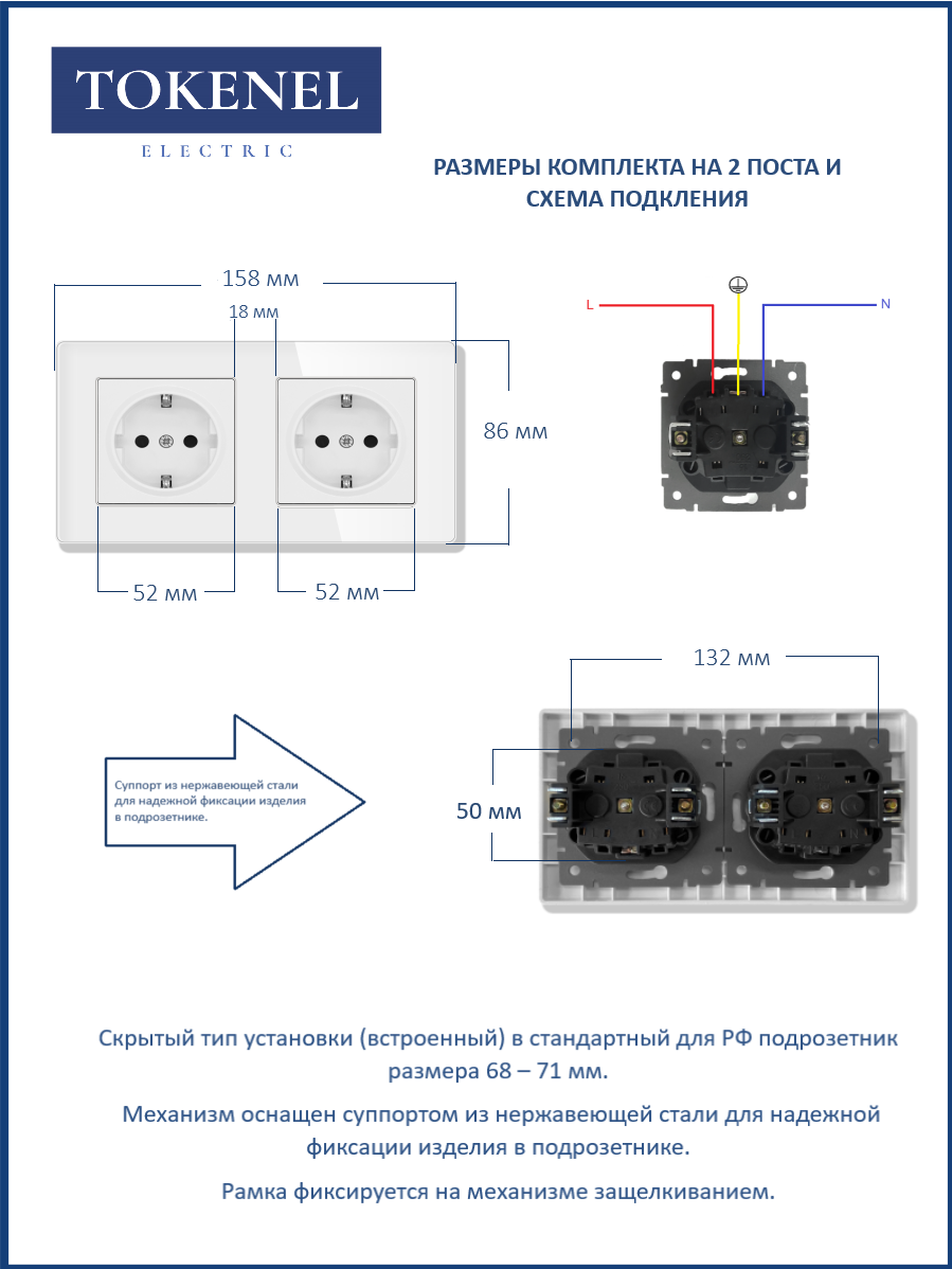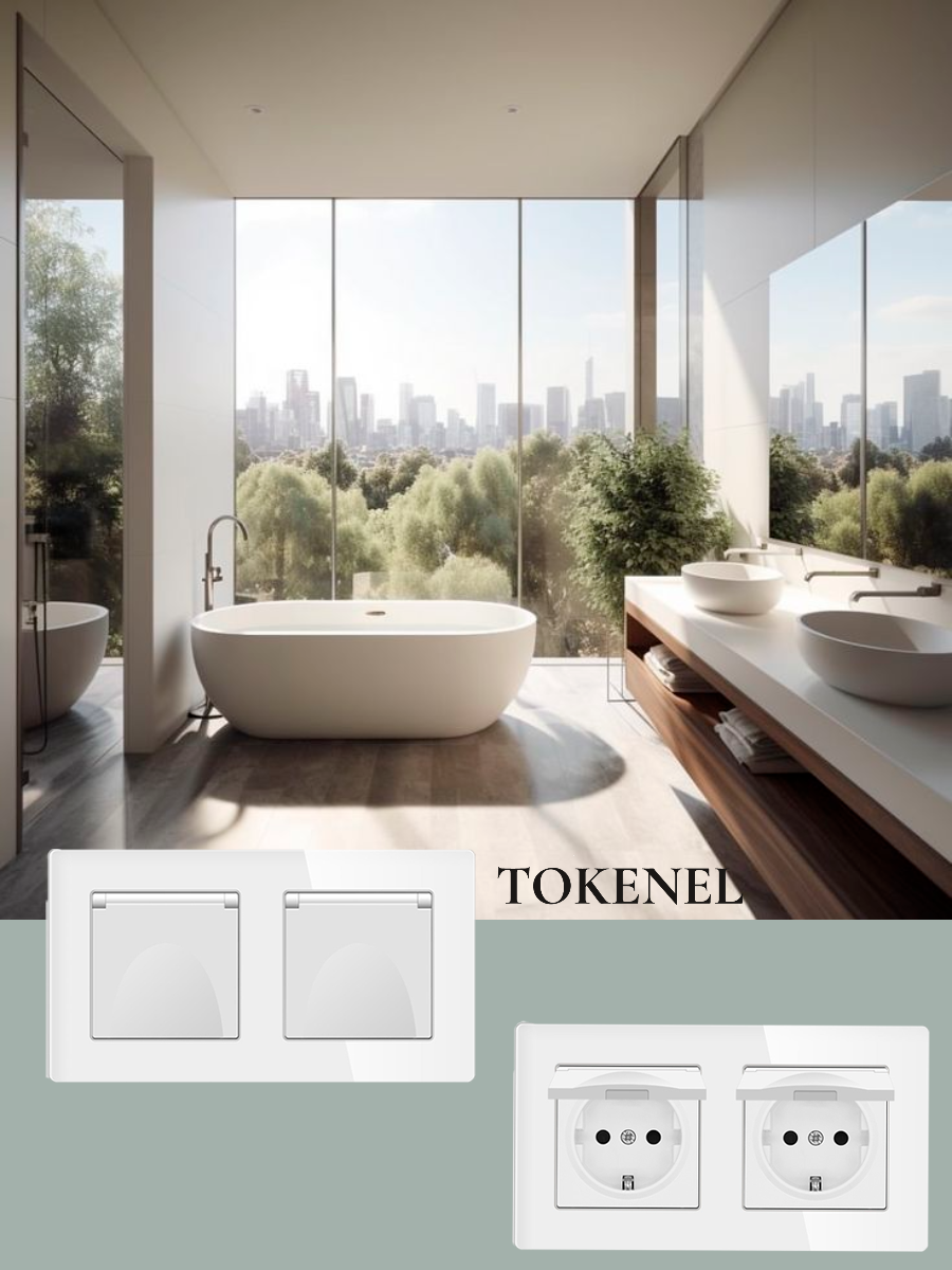 T0000901500/ Розетка встраиваемая TOKENEL электрическая с заземлением и защитными шторками, рамка 86х86 мм, 16A, акриловое стекло, белая